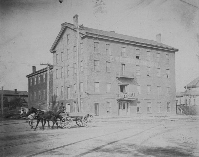 Photograph of Benton House, Lansing, Michigan with horse drawn carriage passing. Built by Bush, Thomas & Lee, opened in 1848 on the northwest corner of Washington Avenue and Main Street. It was the first brick building erected in Lansing. The hotel later became the Everett House. In 1900 the deteriorated hotel was razed and the property sold to R.E. Olds who built his residence on the site in 1903.