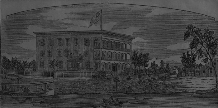 Photo of print of Mineral Well House, Lansing, Michigan. Built by C.Y. Edwards and others 1870, burned 1879. Located on the east side of South River Street while the Bath House and Mineral Well were on the west side , about 75 feet south of the River Street Bridge. The Bath House was later the site of Jarvis Engineering. Hugh Lyons, a former Mayor was in charge of the Bath House and John Smallwood was chief barber. A railroad station was on the grounds and a landing accomodated small steamers that operated on the Grand River.