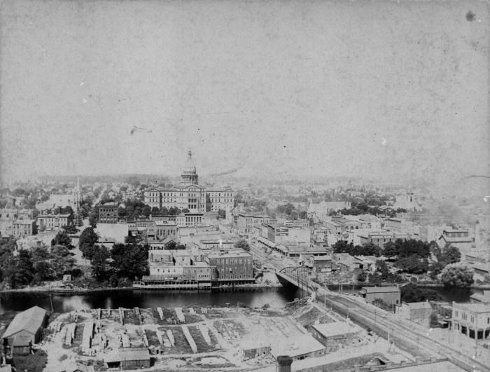 Photograph of view from the standpipe looking west toward the Capitol across the Grand River, Lansing, Michigan. The standpipe was part of the city waterworks and located south of Michigan Avenue on Cedar Street.