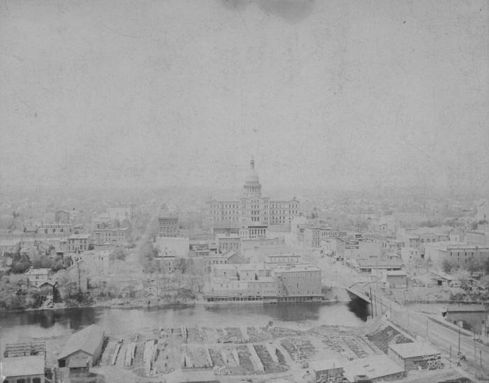Photograph of view from the standpipe, looking west, Lansing, Michigan. The standpipe was part of the city waterworks and located south of Michigan Avenue on Cedar Street.