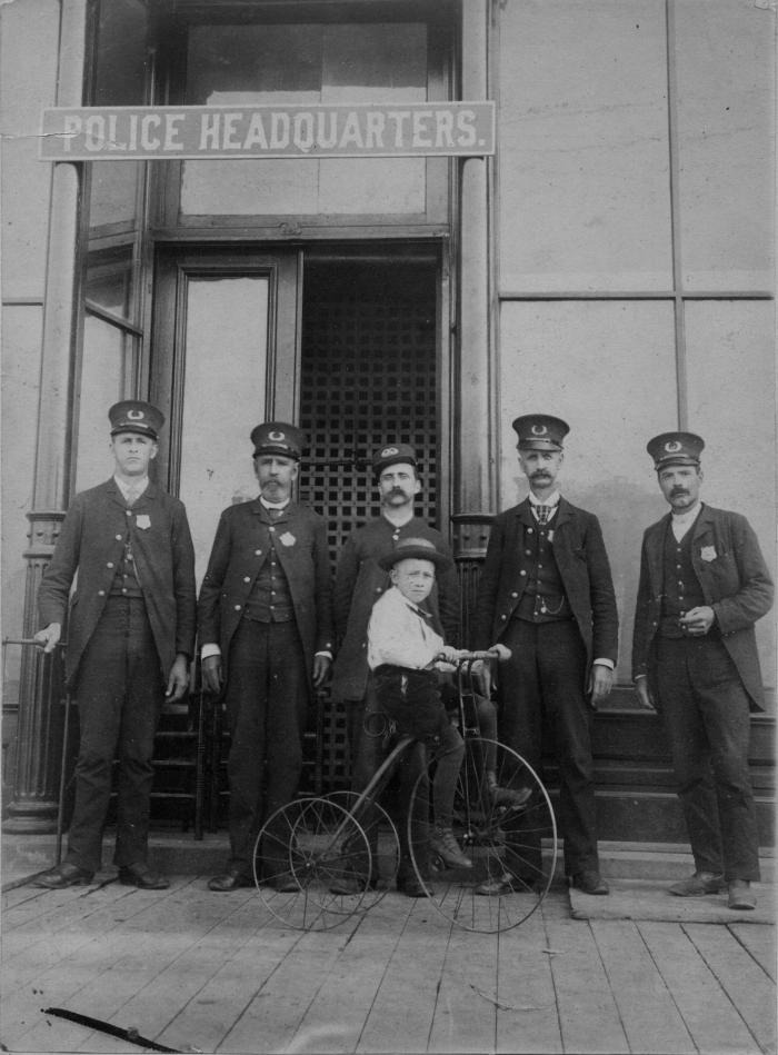 Photo of entire Lansing Police Department. Taken in front of Headquarters located at 204 East Michigan Avenue Lansing, Michigan. From left: George Kohler, John N. Bush, Ed. Bates, Chief, Ben Harrington (father of Ben Harrington on tricycle), John Collins.