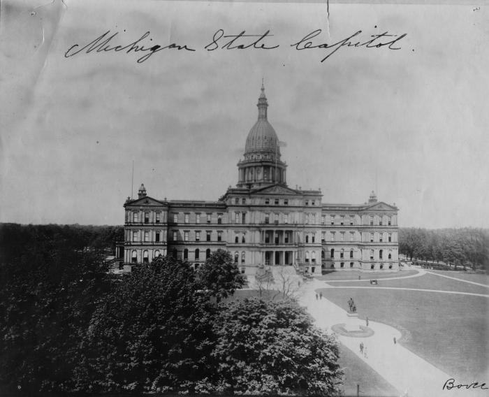 Photograph of State Capitol, Lansing, Michigan. Taken shortly after construction was completed in 1878. The act providing for its erection was passed March 31, 1871. Cornerstone was laid October 2, 1873. Total cost $1,510,130.59. Dedicated and occupied in 1879.