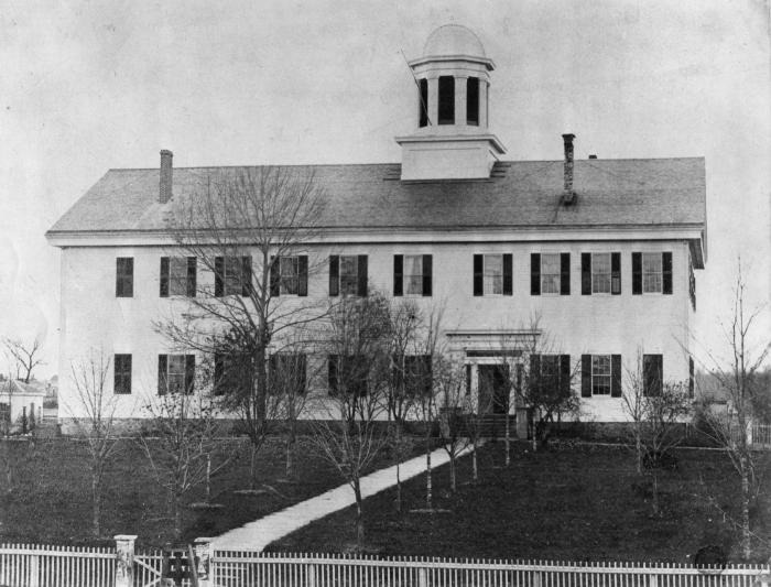 Photograph of first State Capitol building in Lansing, Michigan. A capitol was built 1823-1828 in Detroit and last used by the State Legislature in 1848. This first State Capitol in Lansing was built in 1847 at a cost of $25,952. An addition of 16 feet was made in 1865. State offices were removed to the present capitol in 1879. Destroyed by fire December 16, 1882. It was located in the block where the old Masonic Temple is located, now used by Cooley Law School. The Senate Chamber was in the South (left) end and, in the north, the House of Representatives.