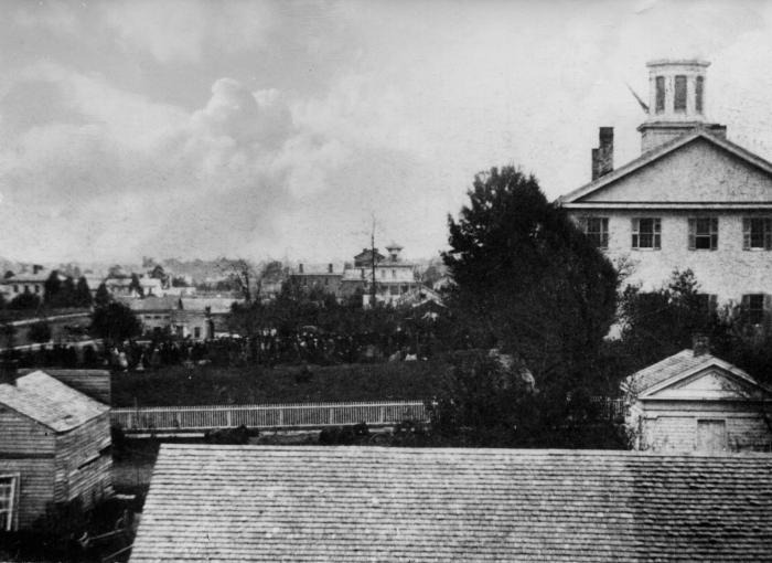 Photograph of first State Capitol, Lansing, Michigan. Taken from north of the building, on the occasion of public funeral services for President Lincoln.