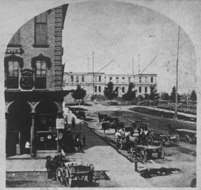 Photograph of State Capitol during construction, Lansing, Michigan. Taken from Washington Avenue at Michigan Avenue. A variety of horse drawn carriages are present.