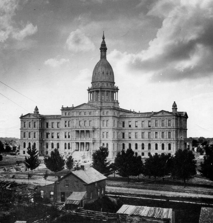 Photograph of State Capitol taken shortly after completion, Lansing, Michigan. Temporary structures are still in front of the building. The dwelling in the lower foreground belonged to Mr. Driscoll who served as janitor in the State Republican (newspaper) building.