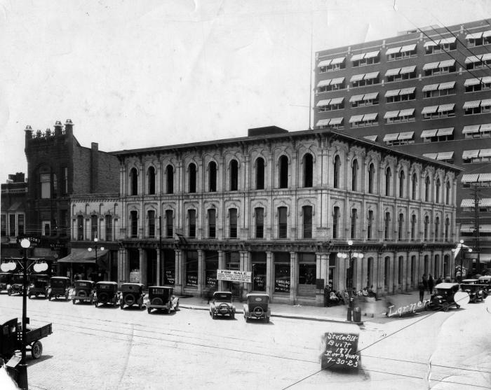 Photograph of temporary state office building, Lansing, Michigan. Built in 1871 on the corner of Allegan street and Washington Avenue, 85 by 100 feet, to house the state offices while the present capitol building was being erected. Cost $30,694. The last state office was removed as late as 1923, when the building was sold to United Cigar Co., for $404,500. Razed July 30, 1923.