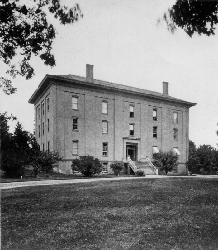 Photograph of College Hall, Michigan Agricultural College (MAC), East Lansing, Michigan. Photograph taken from a stereoptican view by J.H. Scotford.