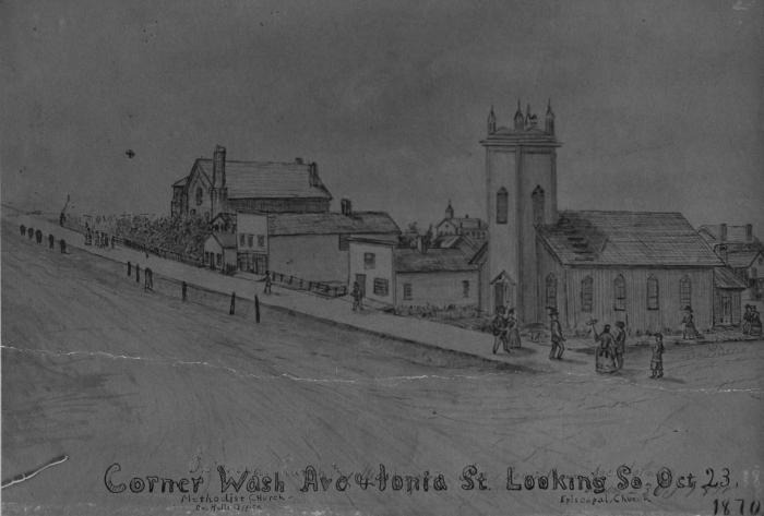 Photograph of drawing depicting view of Washington Avenue at Ionia Street looking south, Lansing. The drawing annotates the building on the right as the Episcopal Church and on the left, the Methodist Church and Doc Holl's Office. The site of the Methodist Church later became the location of the Tussing Building.