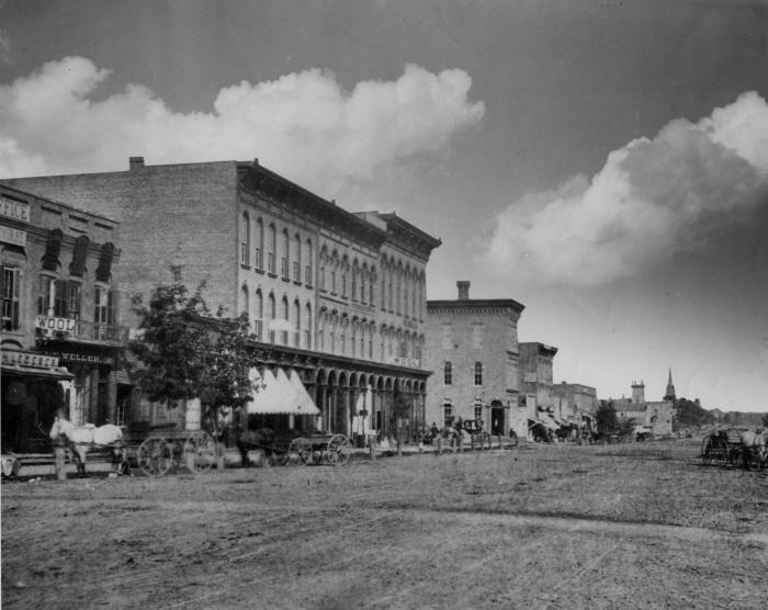 Photograph of corner of Michigan and Washington Avenues, Lansing, Michigan.
