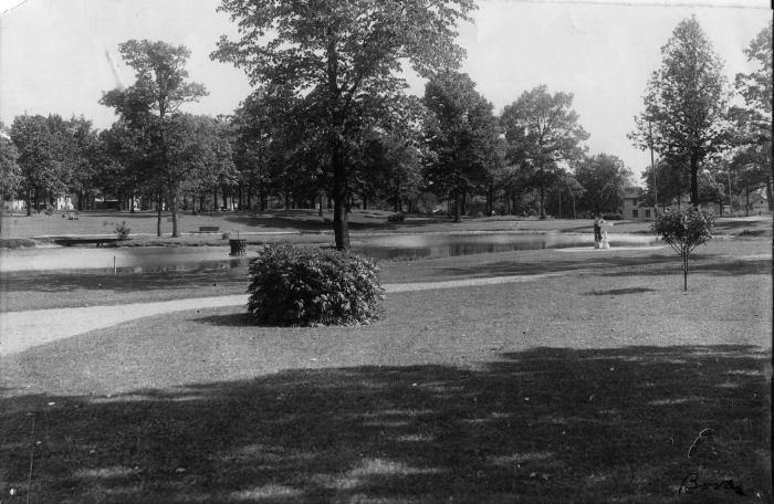 Photograph of Oak Park, Lansing. Comprising 20 acres, also known as East Side Park. Originally used as a cemetery until additional burial space was required. Monuments and remains were then moved to the Mt. Hope Cemetery.
