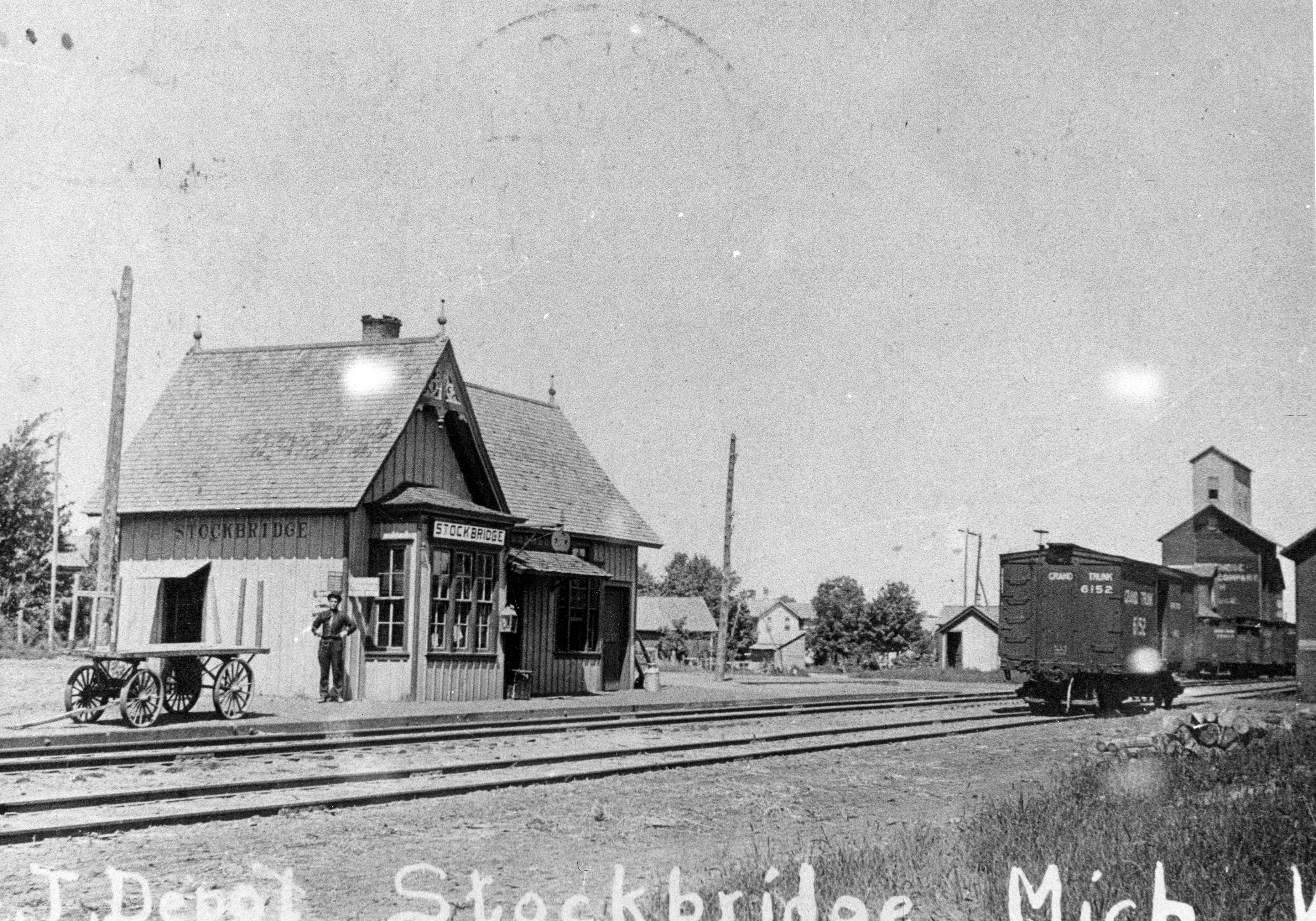 Photograph of Grand Trunk Depot from card dated 1910. DePuy Elevator off to right.