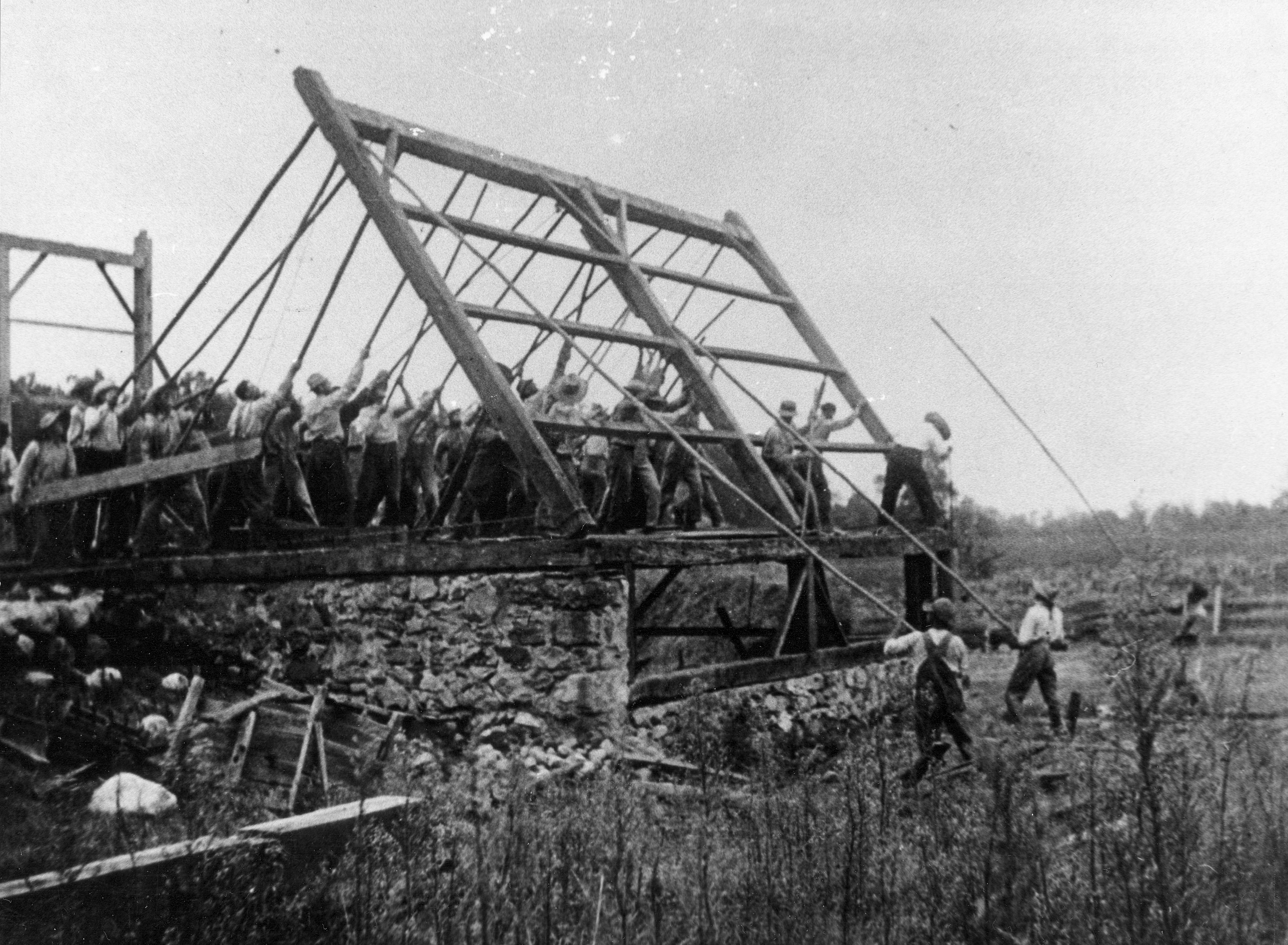 Photograph of raising the Bowdish barn (later Norm Kaiser's) after the tornado of July 1913.