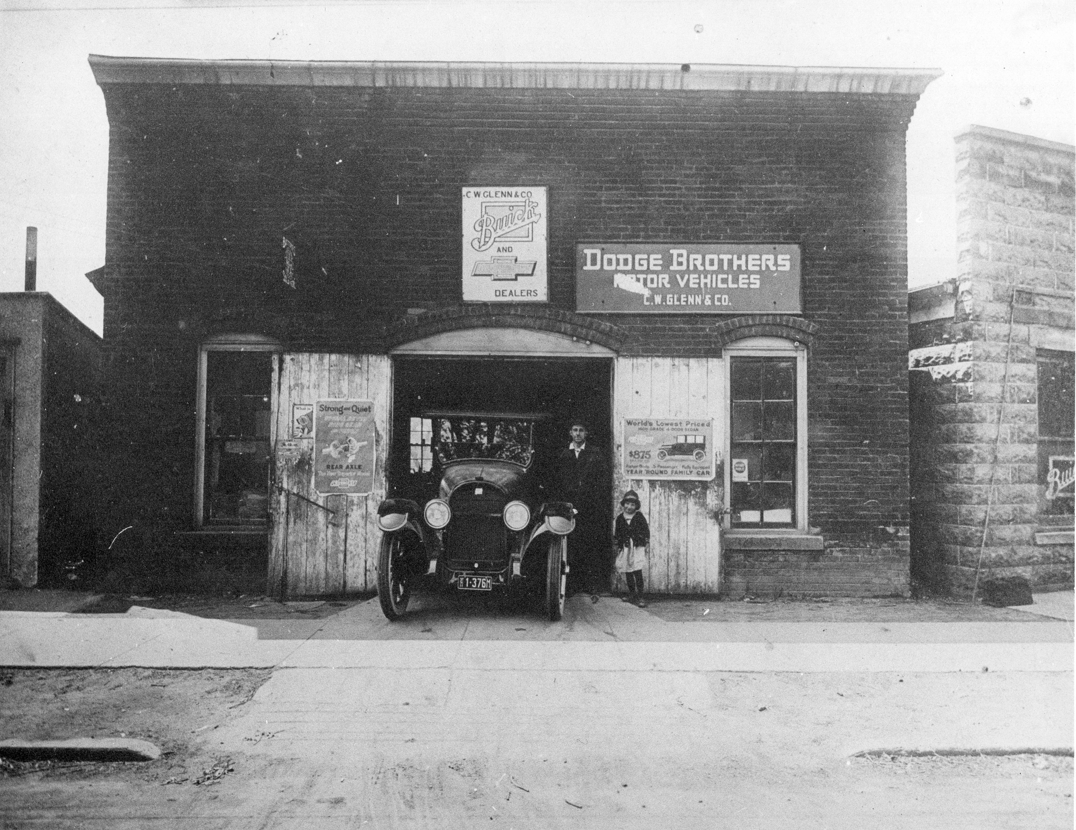 Photograph of C.W. Glenn Garage with automobile. Casper and Gene Glenn Barton in frame. C.J. Lantis, 123 W. Main at right.