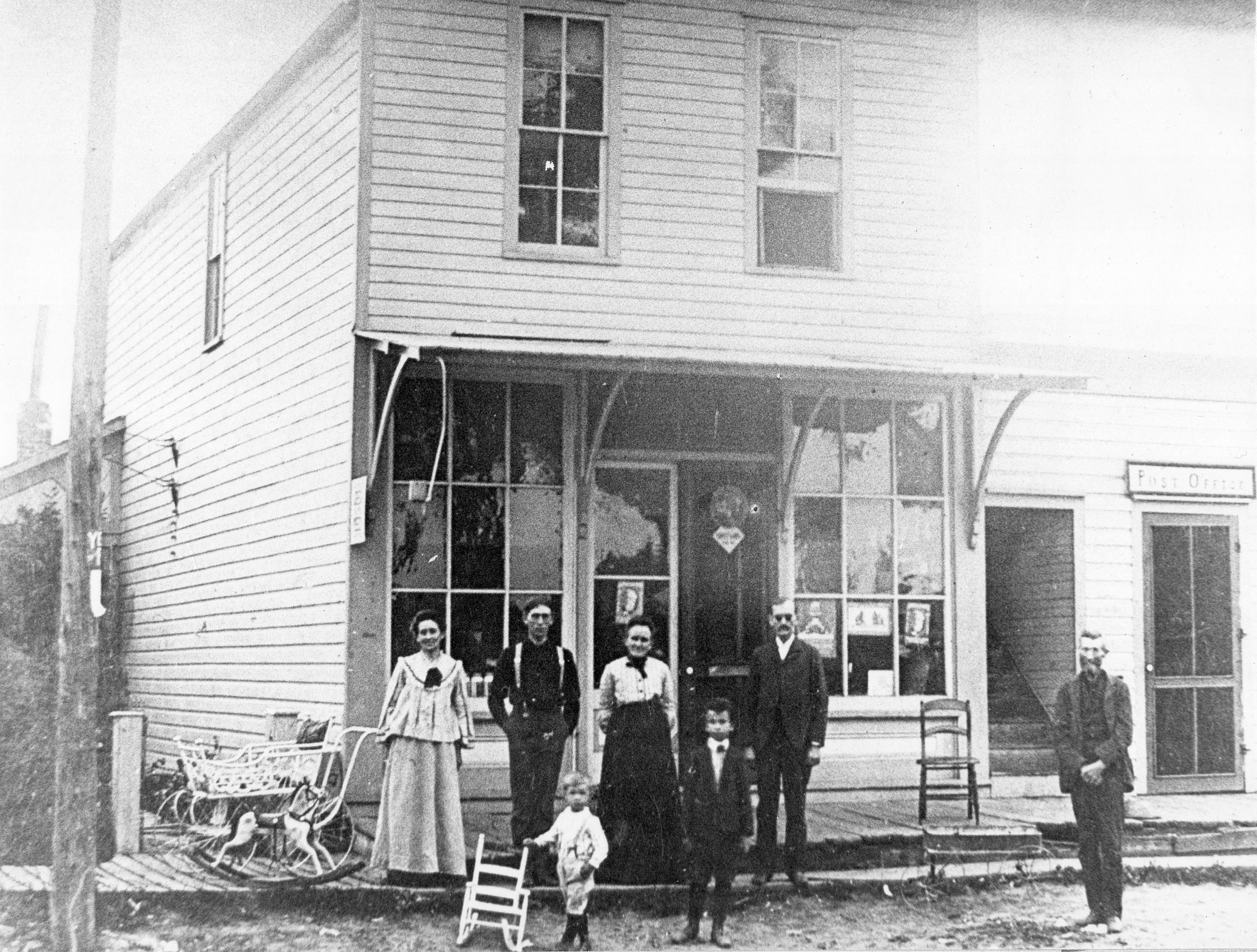 Photograph of the combined Post Office and Store with five unidentified individuals.