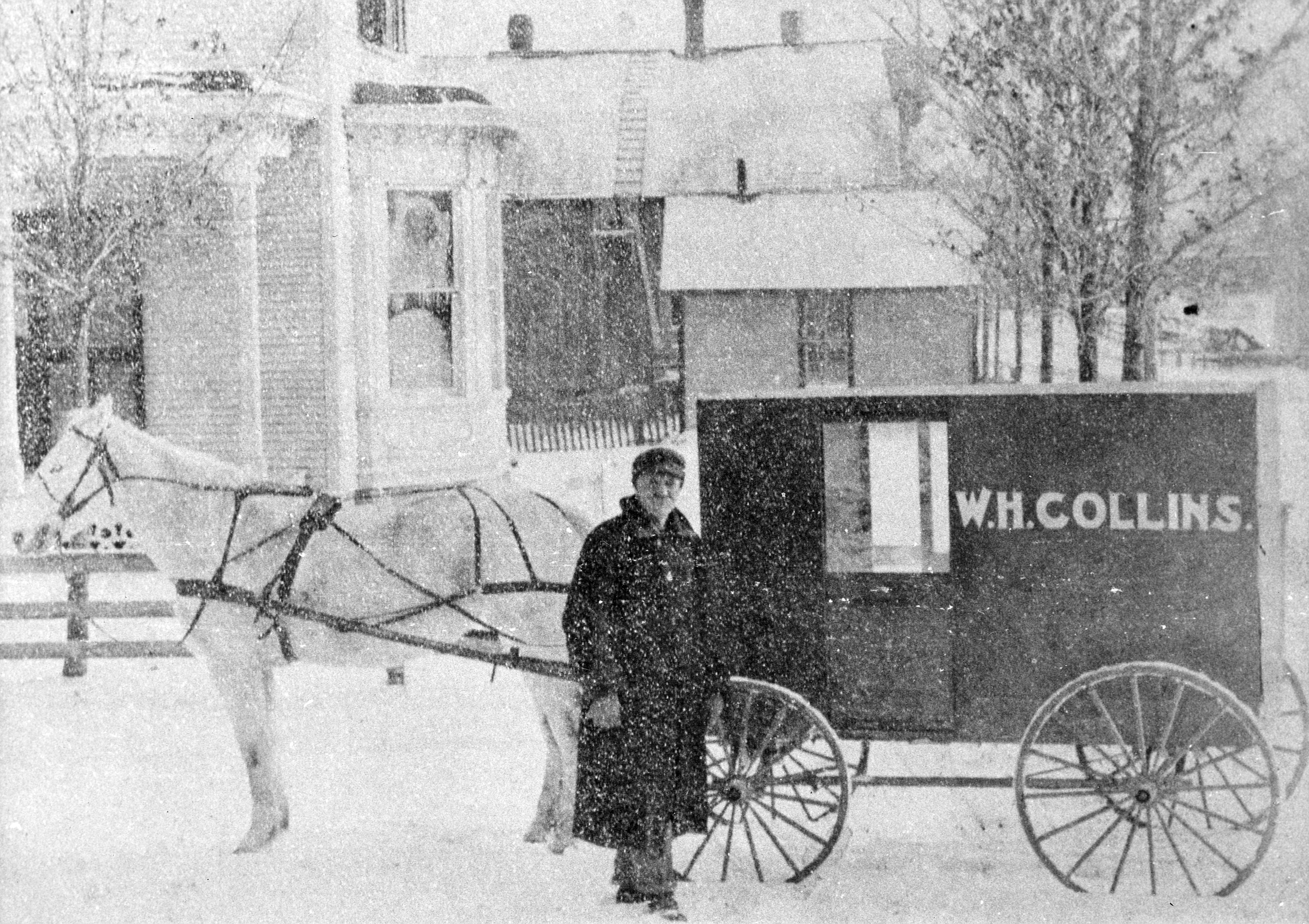 Photograph of H.W. Collins Milk Wagon at 304 East Main Street; basket factory in background.