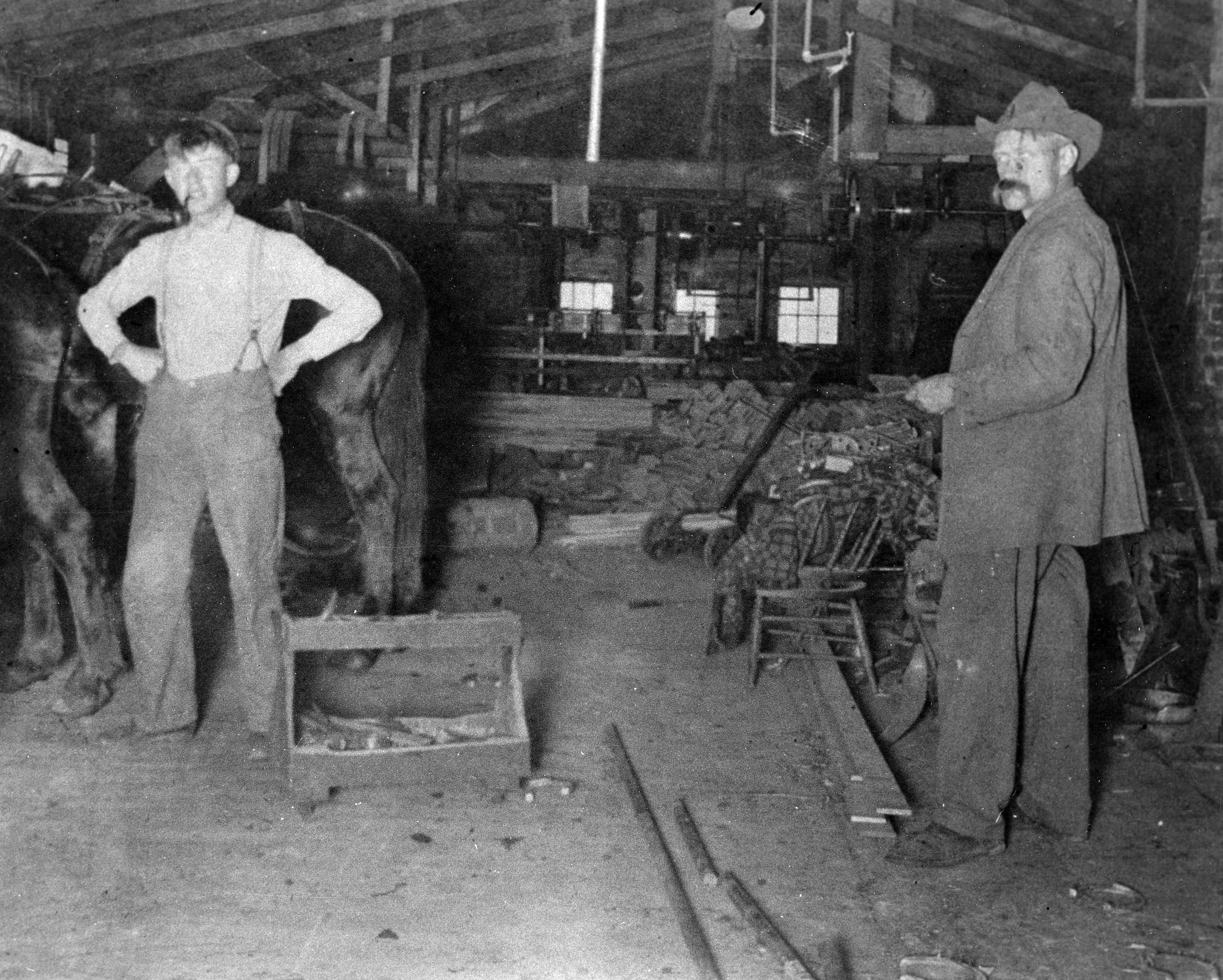 Photograph of the Dickinson Blacksmith Shop. Left to right Ernie Dickinson & Jesse Dickinson.