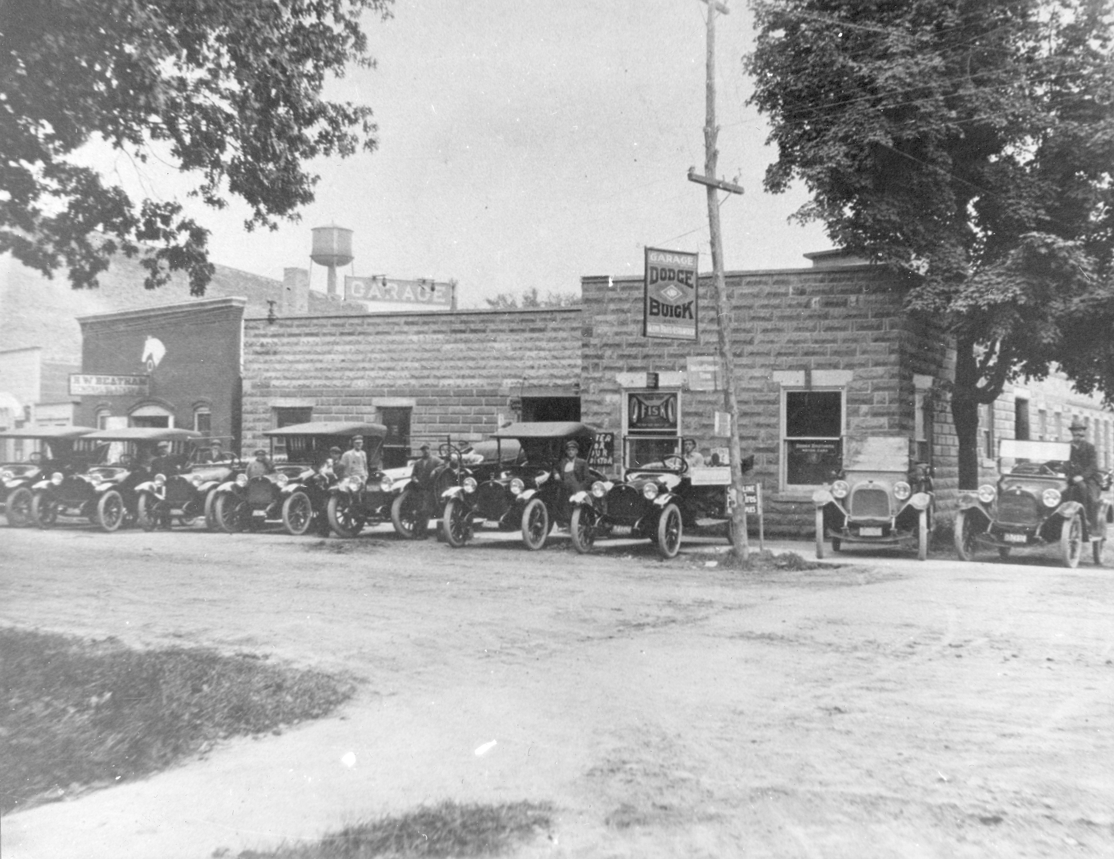 Photograph of the Glenn Brothers Garage, established in 1913. Next door is Beatham Blacksmith shop. Left to right Caspar Glenn, unknown, unknown, unknown, Jay Asquith, Chris Taylor, Wilbur Ostrander, Frank Burgess, George Backus.