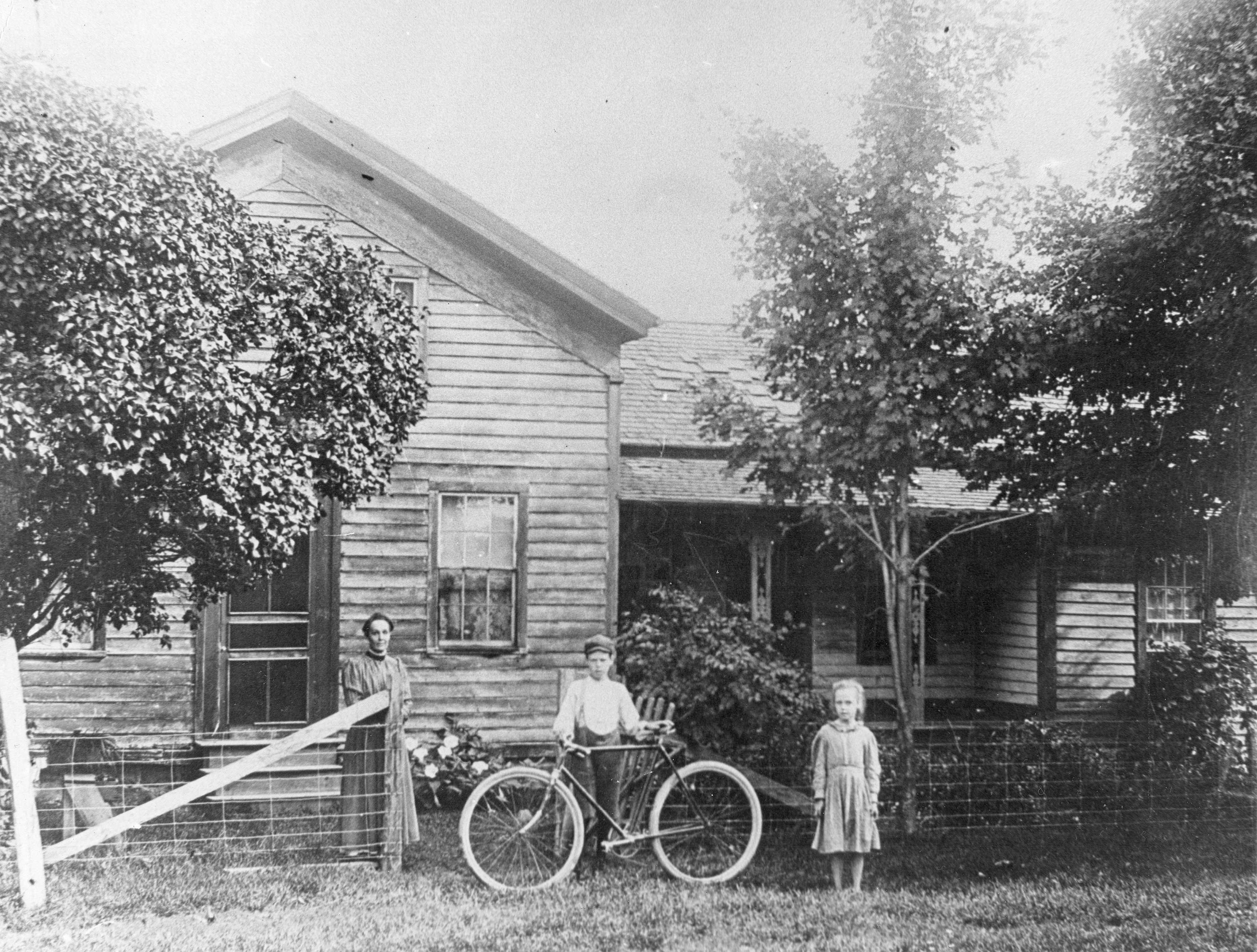 Group of three comprised of a woman, boy with bicycle and girl standing in front of a home.