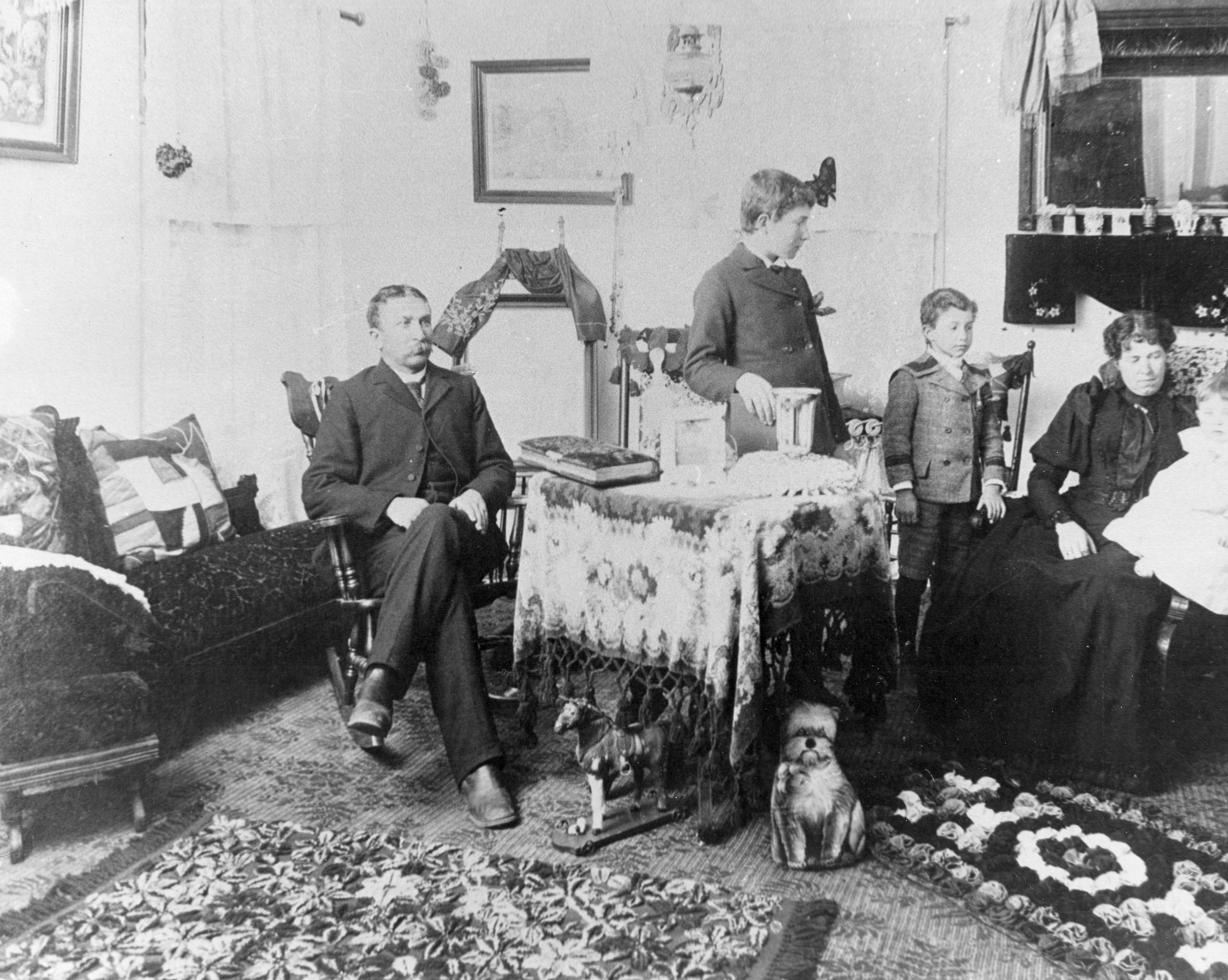 Photograph of Mayer Family in parlor. Left to right Frederick W. Mayer, Arthur Mayer, Frank Mayer, Sarah Reithmiller Mayer and Irene Mayer. Information provided by Suzanne Mayer Bernardon.