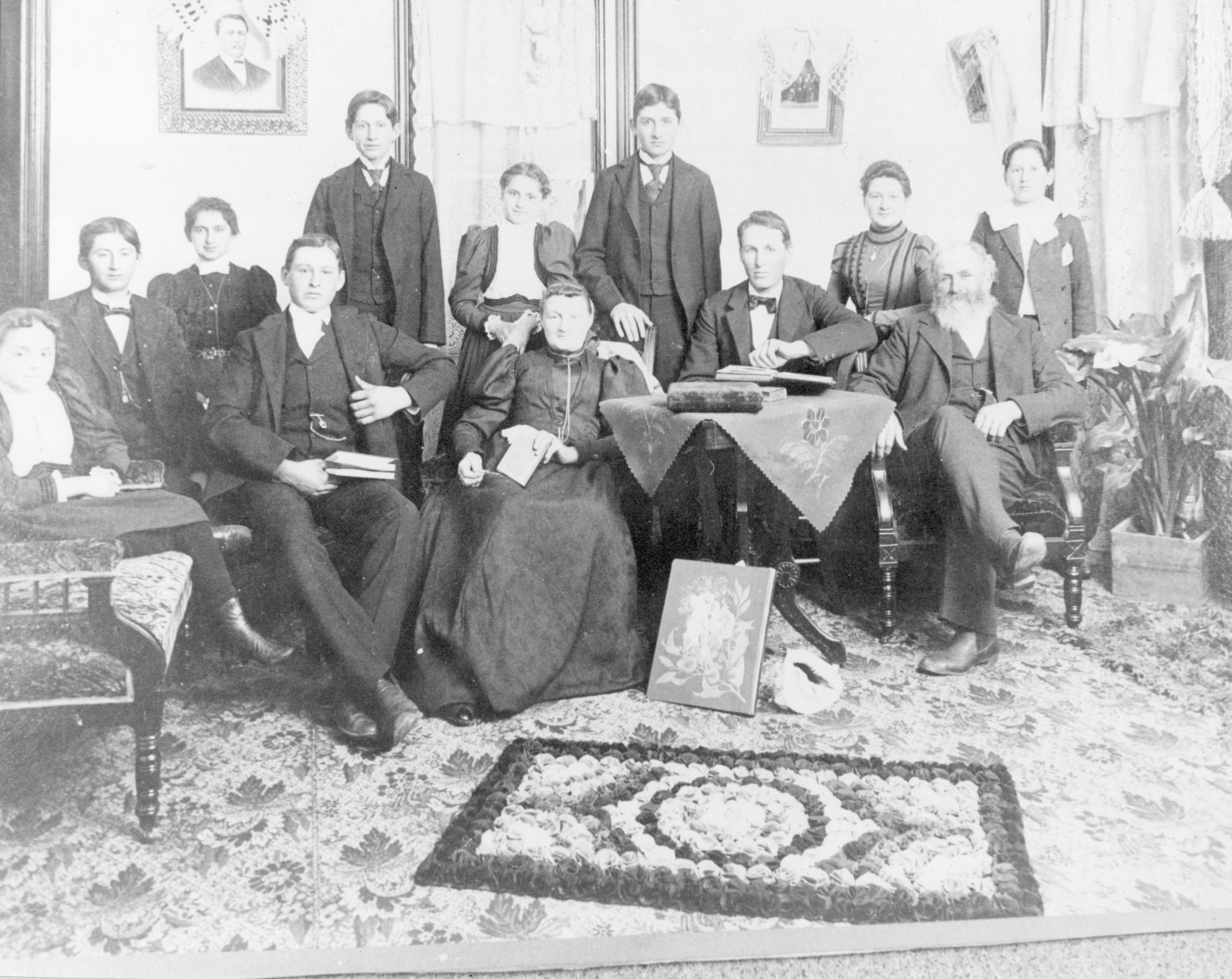 Portrait of the Moeckel family. Left to right Lina (Mrs. John Harr), Aaron, Beda (Mrs. Will Artz), Carl, Ottmar, Lillian (Mrs. Aaron Hannewald), Mrs. Charles Moeckel, Walter, Edgar, Cornelia (Mrs. Edward Curry) and Charles. One boy's name is missing.