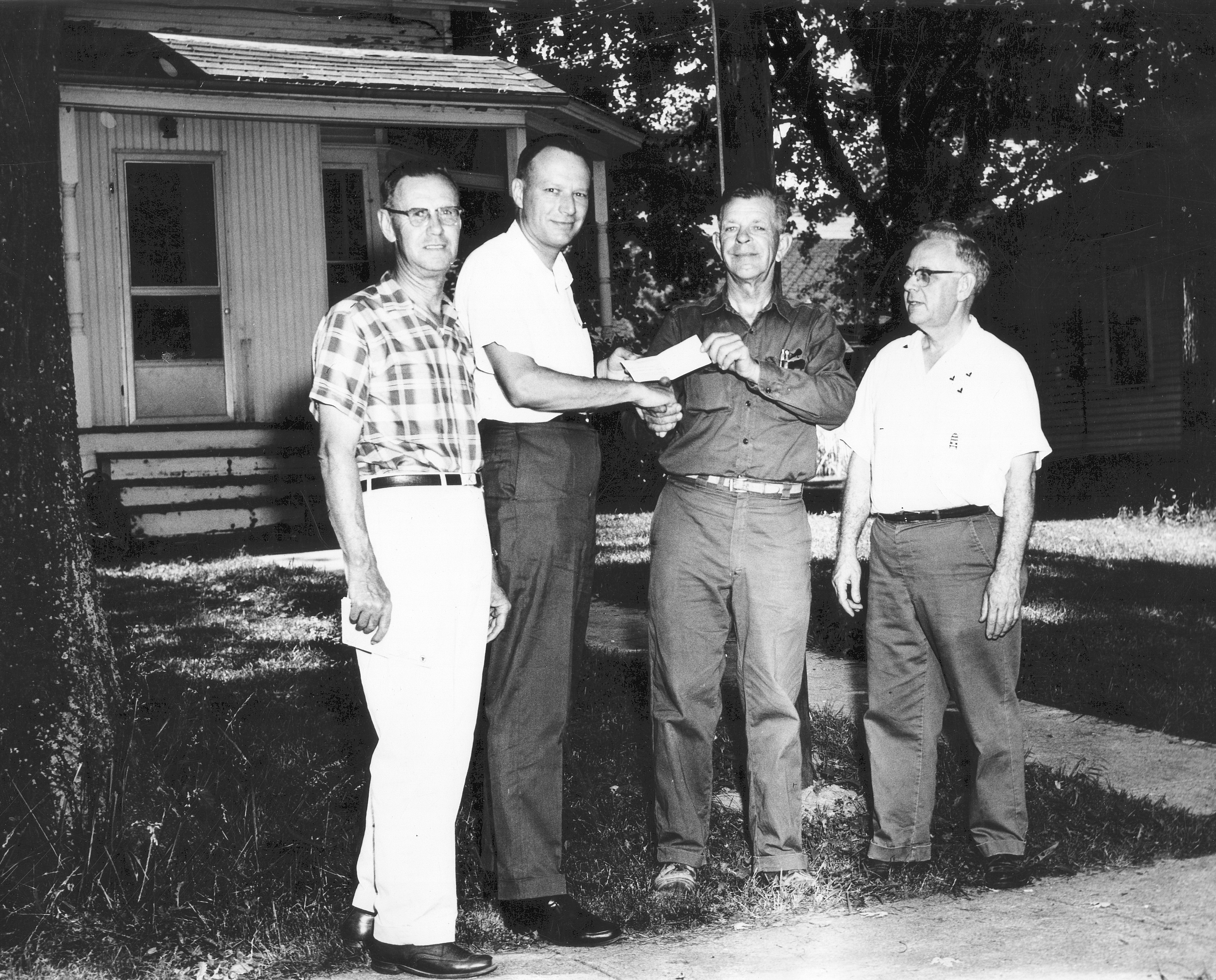 Photograph of four men holding a check? Left to right Gordon Keeper, Larry Lindermer and 2 unknowns from Munith.