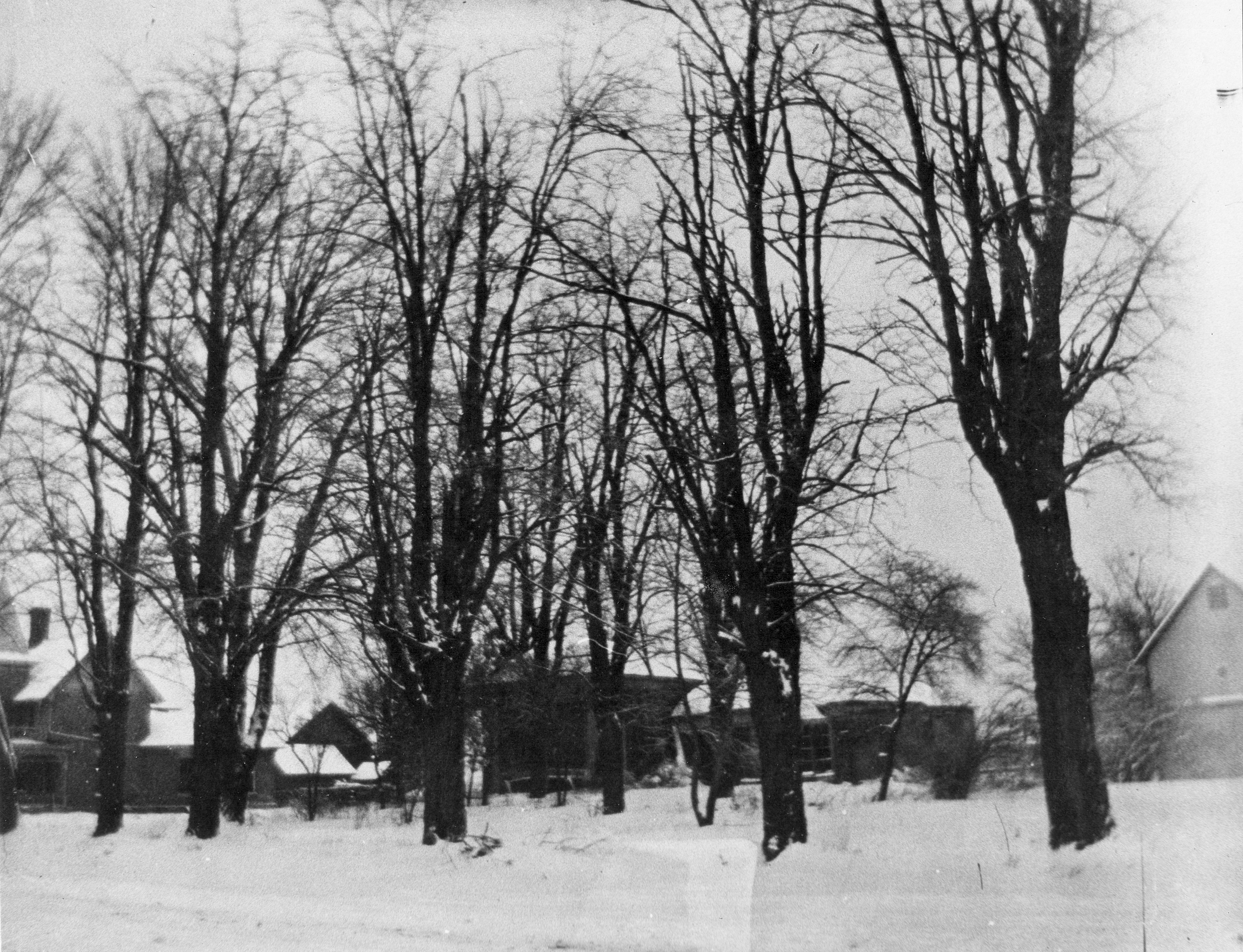 Photograph of house and woods in village. Far left is home of A.A. Hall, center is Grandma Miller's house.