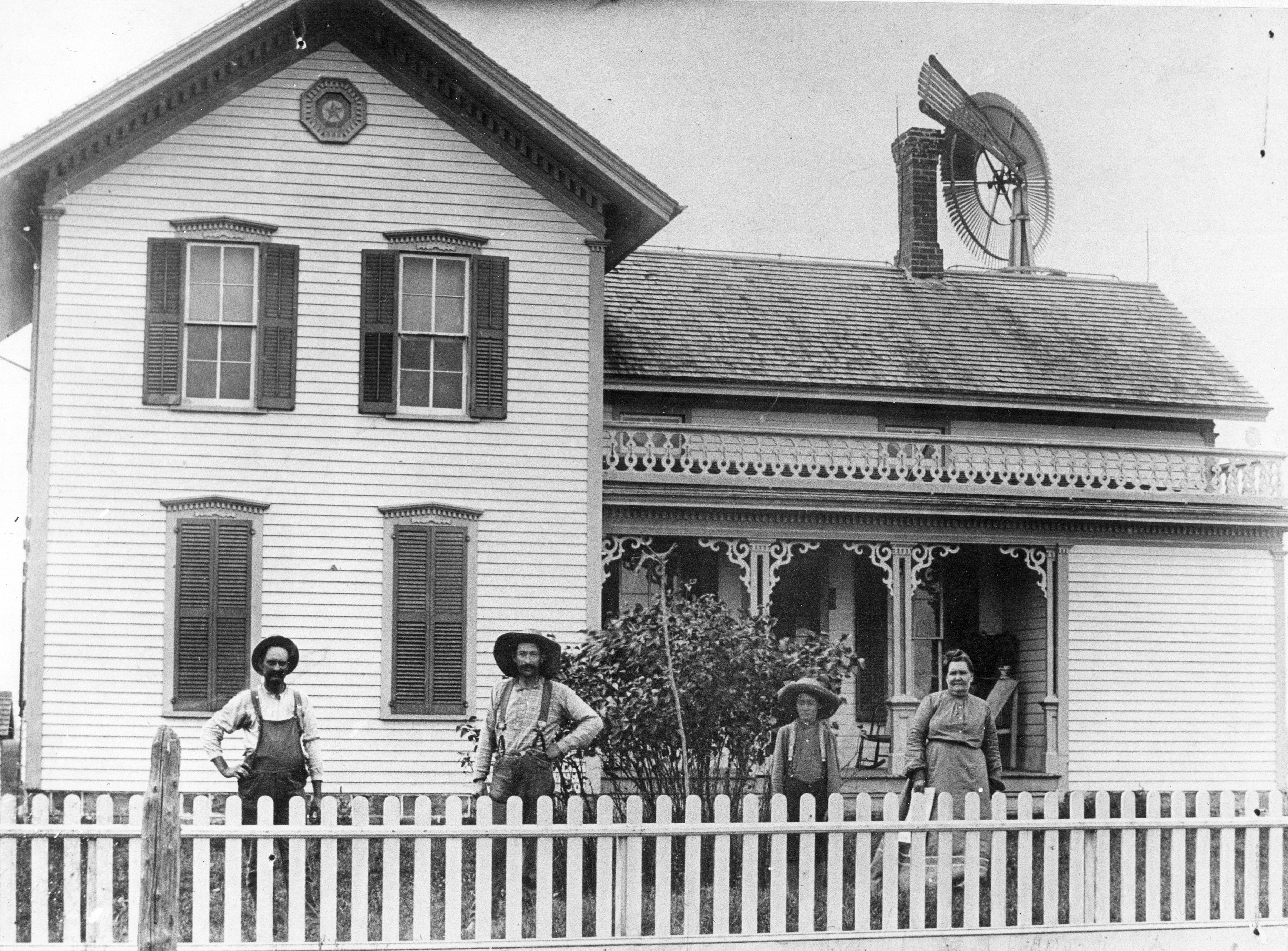 Photograph of the Roger Derby Farm house with four unidentified individuals outside.It resided at 3478 Heeney Road. It was Milo Smith's then Ted Fay's.