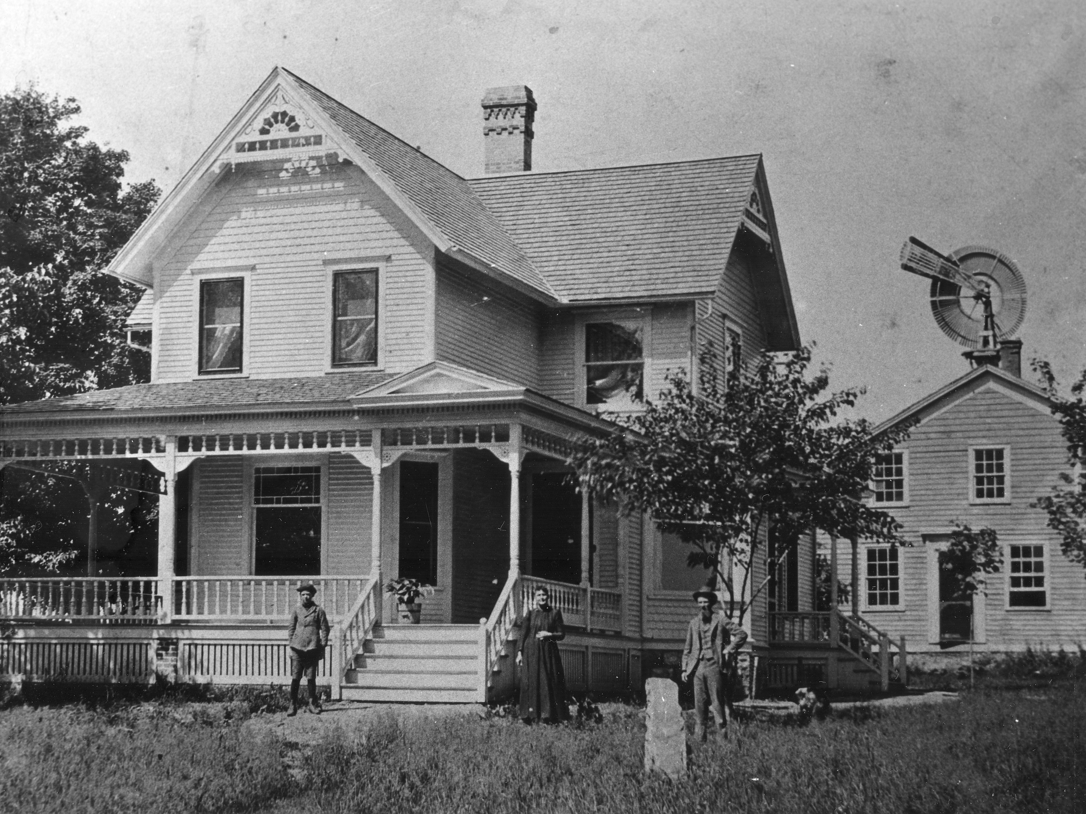 Photograph of the Mitteer farm and residence built in 1892. The original house and windmill are in rear. Three unidentified individuals stand on the front lawn.