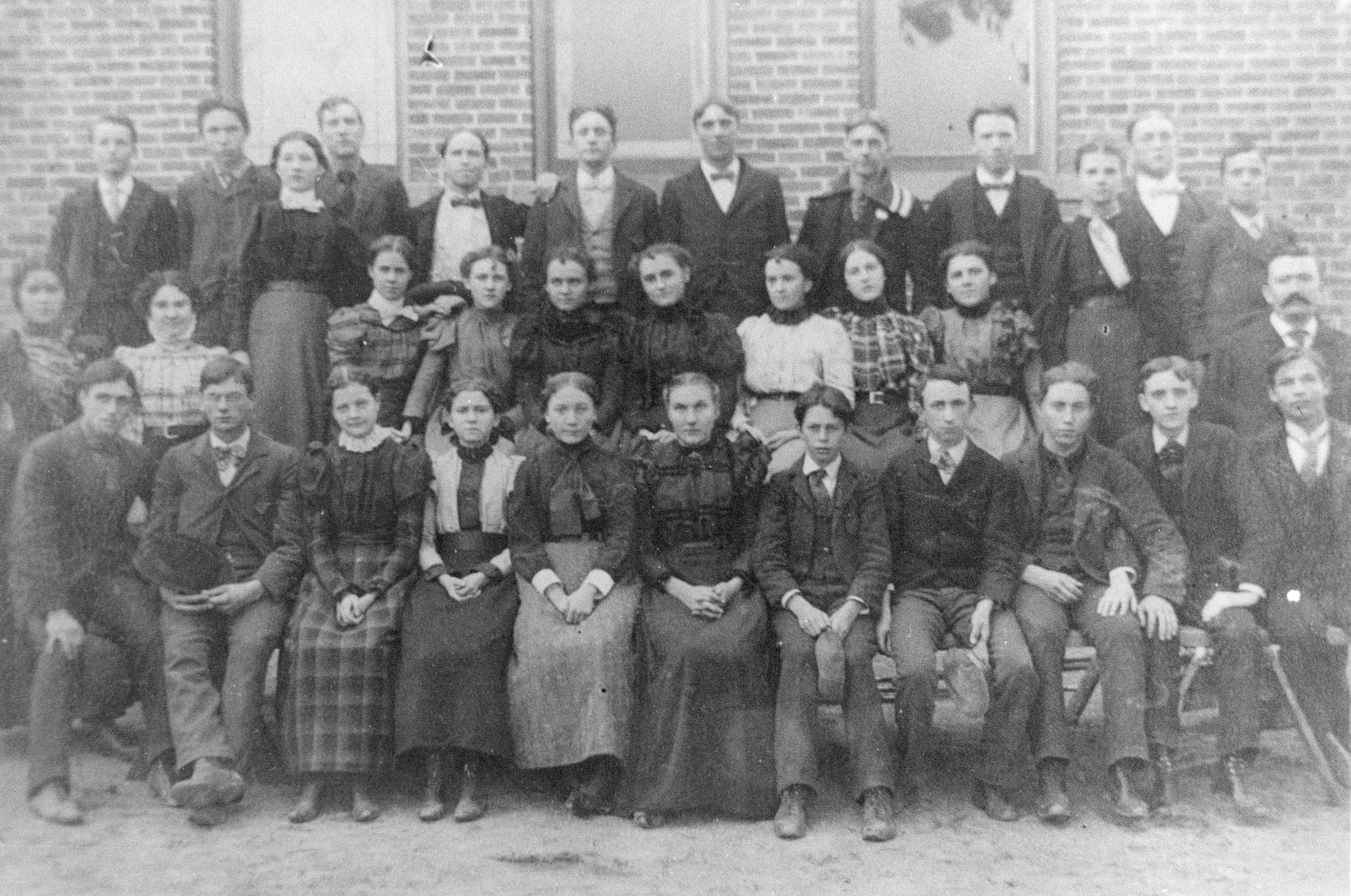 Photograph of Stockbridge High School about 1900. Back row left to right Clarence Richmond, Burt McKenzie, B. Brower, Anna Springman, Will Kennedy, F. Binding, unknown, Will Wright, E. Kennedy, Bertha Collings, C. Siegfried, John Berry. Center row left to right E. Gildart, J. Lowe, Eunice Skidmore, A. Morgan, H. Hall, Vina Berry, L. Knight, M. Willmore, F. Lee, Prof. Small. Front row Gar Clark, unknown, Irene Stillson, Bonnie Lowe, Mabel Grimes, Clara Noyes, Ralph Gildart, Gene Berry, Bern West, C. Barrett, C. Lee.