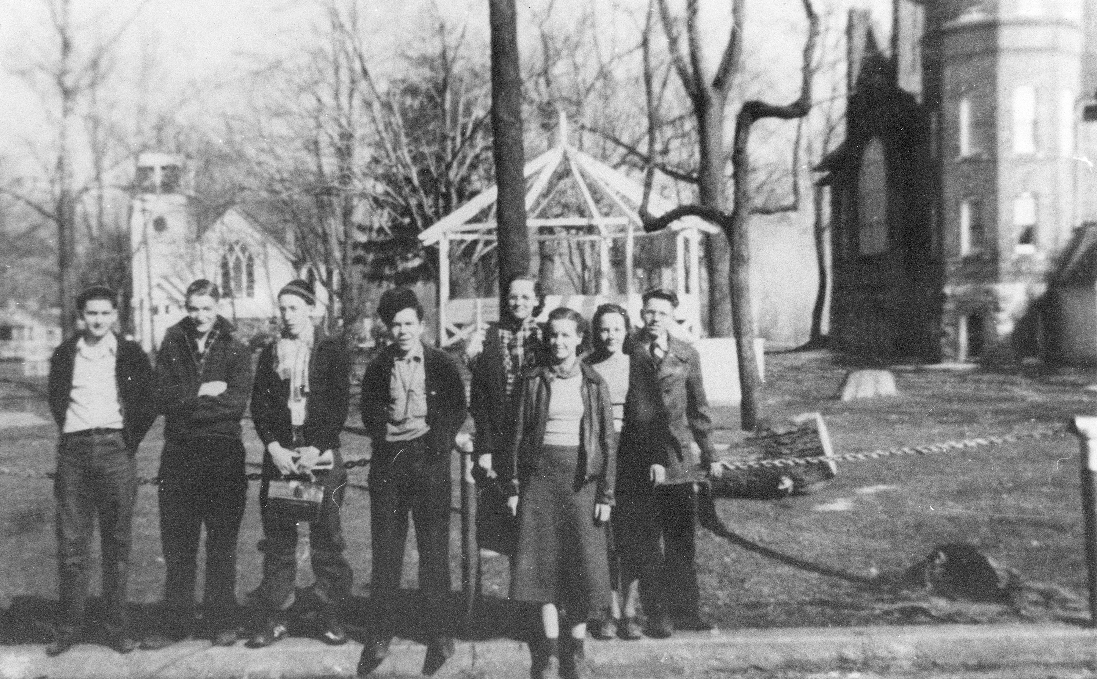 Photograph of a High School group with Band Stand in background. Left to right Donald Smith, Patrick Lovey, Victor Feldspauch, Forest Hartley, Margaret Pinckney Simonds, Ardith Wright Holloway, Peggy Cranna Stoffer, Carol Meade. This picture was donated by Aletha Lehman.