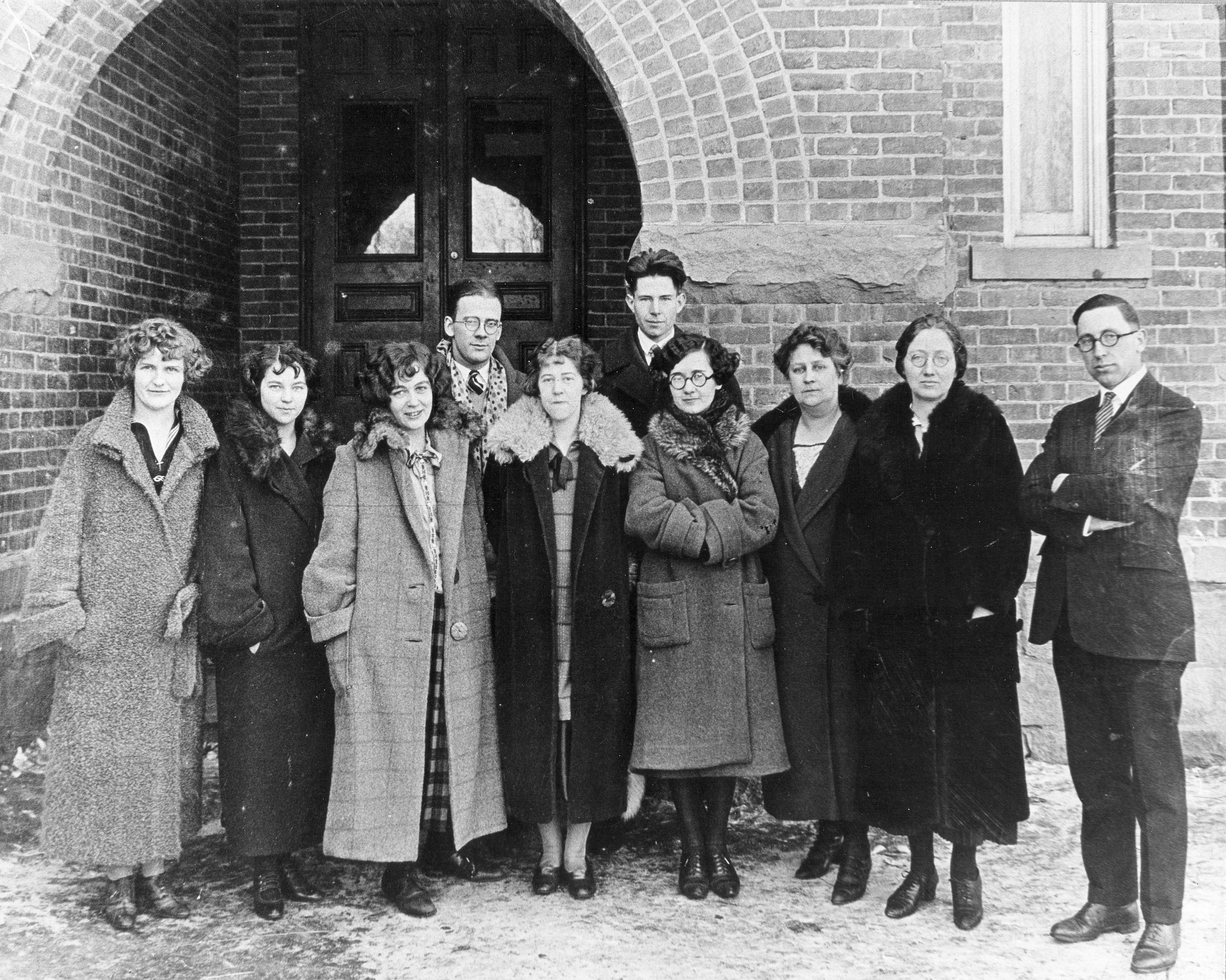 Photograph of Stockbridge High School teachers. Left to right Hazel Mears Harr, Principla Miss McKenzie, Dorothy Parent Huttenlocker, William Sage, Ethel Davis Rockwell, Hiram Nutt, Nellie Applegate, Mrs. Roepke, Emma Smith, Floyd Haight, Supt.