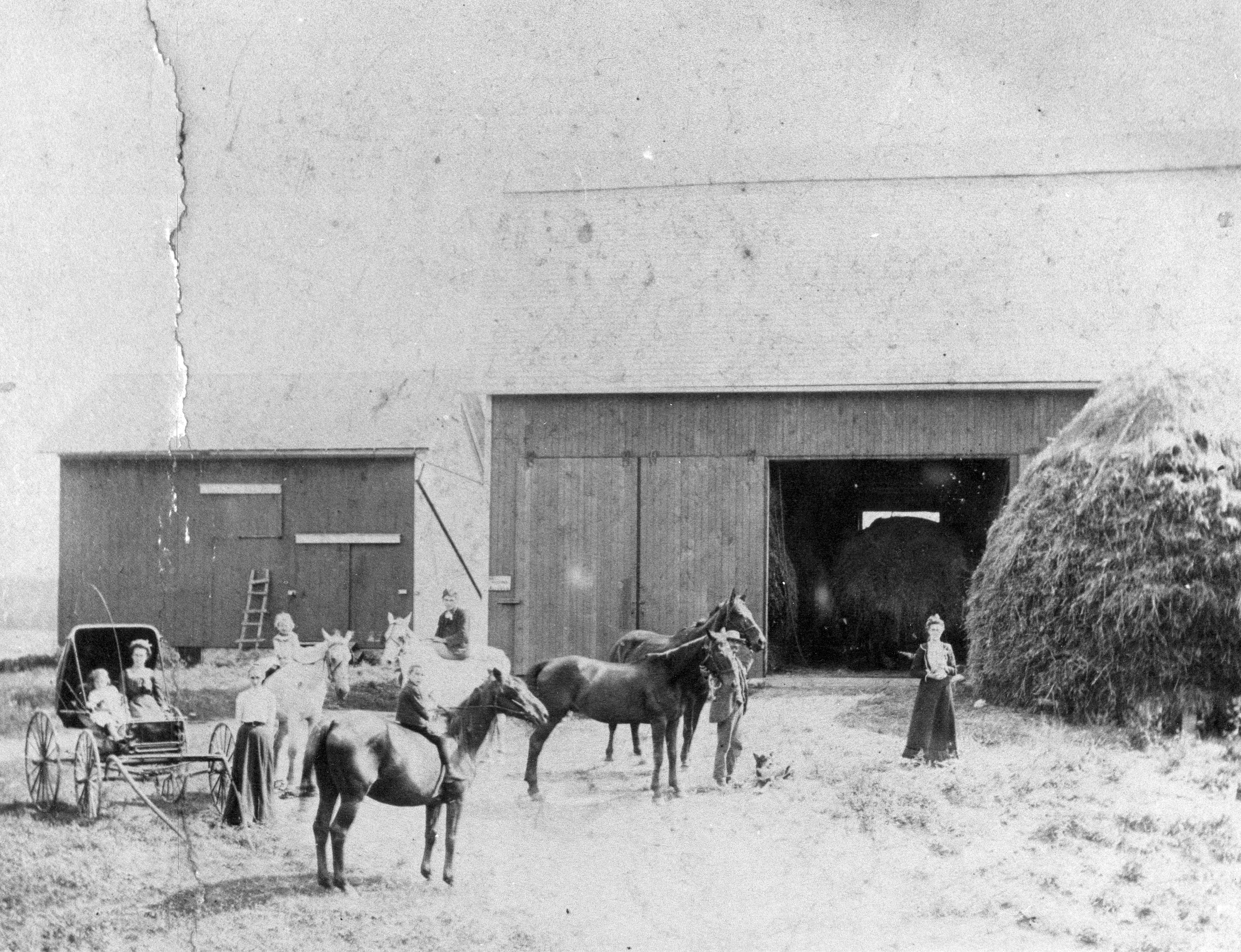 Photograph of barnyard with horses, buggies, women and children. Unknown site.