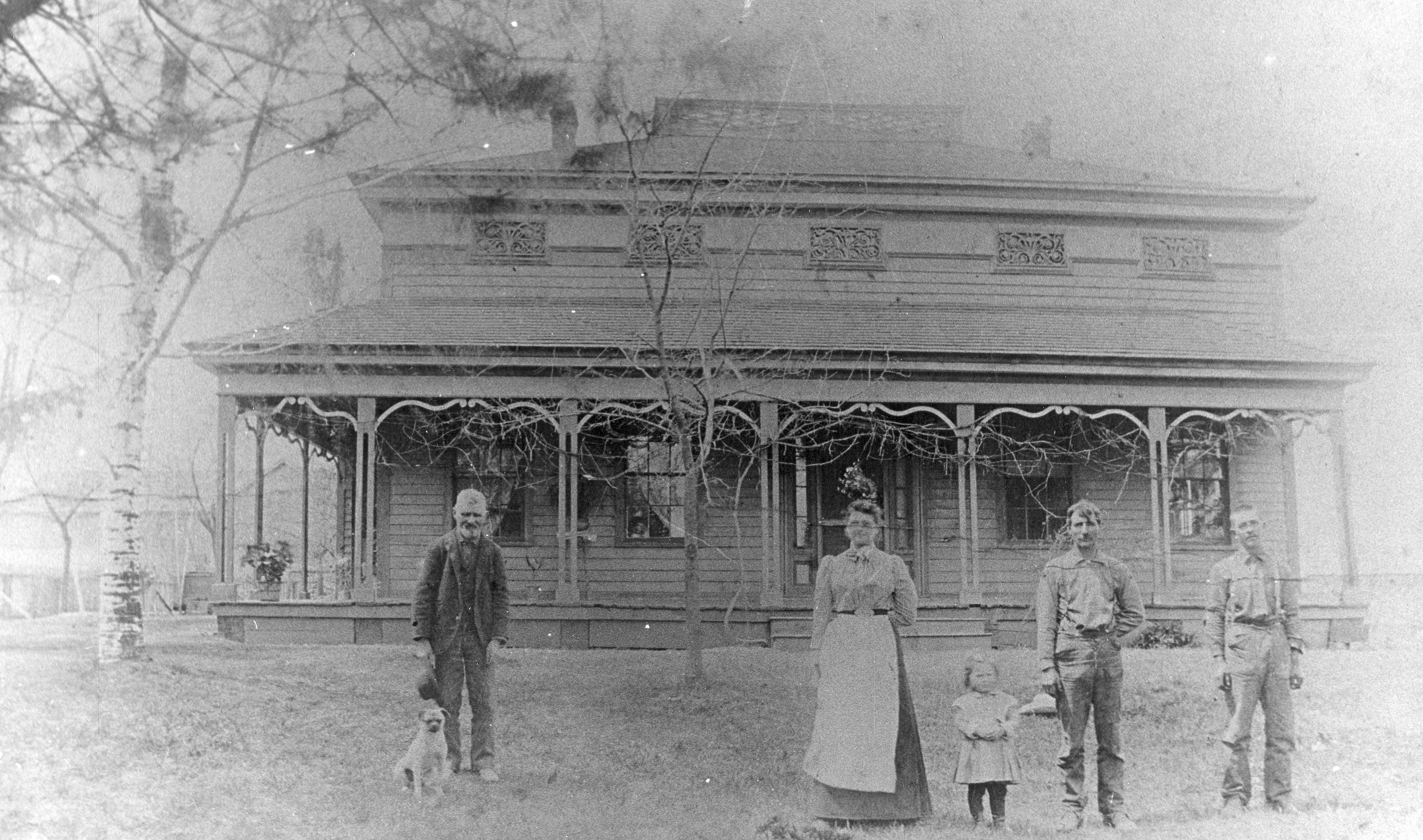Photograph of the Harrlands about 1900. Left to right John Jacob Harr with dog, Lina Harr, Theron Harr, John G. Harr and an unidentified hired man.