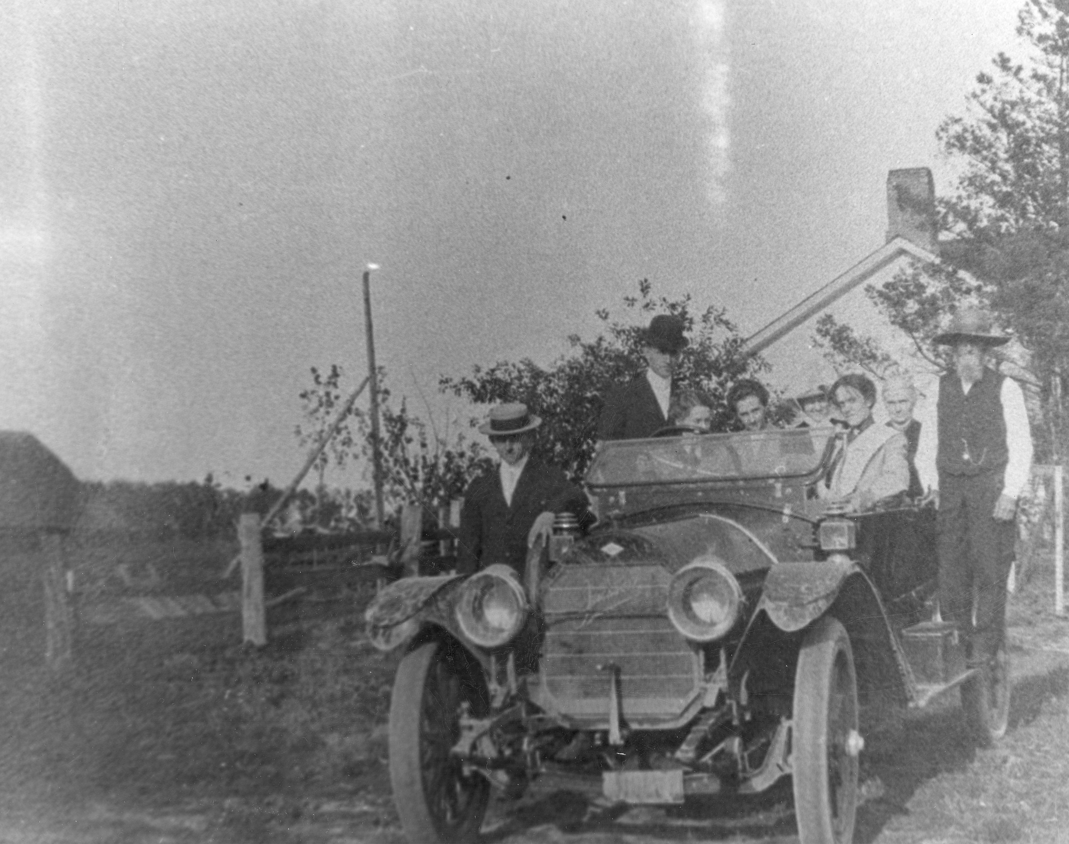 Photograph of seven individuals in and around Joe Weinholtz's car on September 19, 1912. The description does not completely fit the photograph. Left to right Theodore Schmidt, Oscar A. Schmidt, unknown, Ida c. Schmidt, Stacia Schmidt, Children of Catherine and John Schmidt.