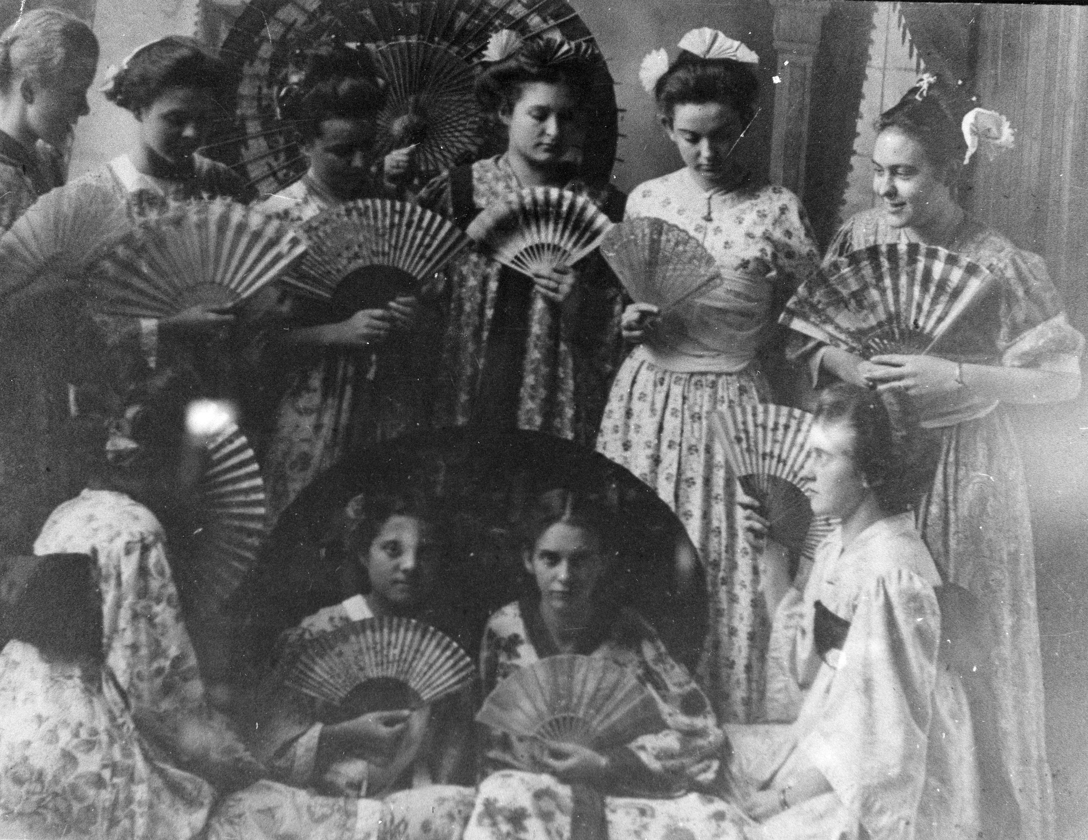 Photograph of the Methodist 'Just Us Girls' Club. Left to right Margaret Marshall Cavender, Hazel Hall Ostrander, unknown, Dora Reeves Leimhaus, Fern Boyce, Jennie Hudler, unknown, Fern Hall, Myra Singleton Cooper, Monabelle Proctor Dancer.