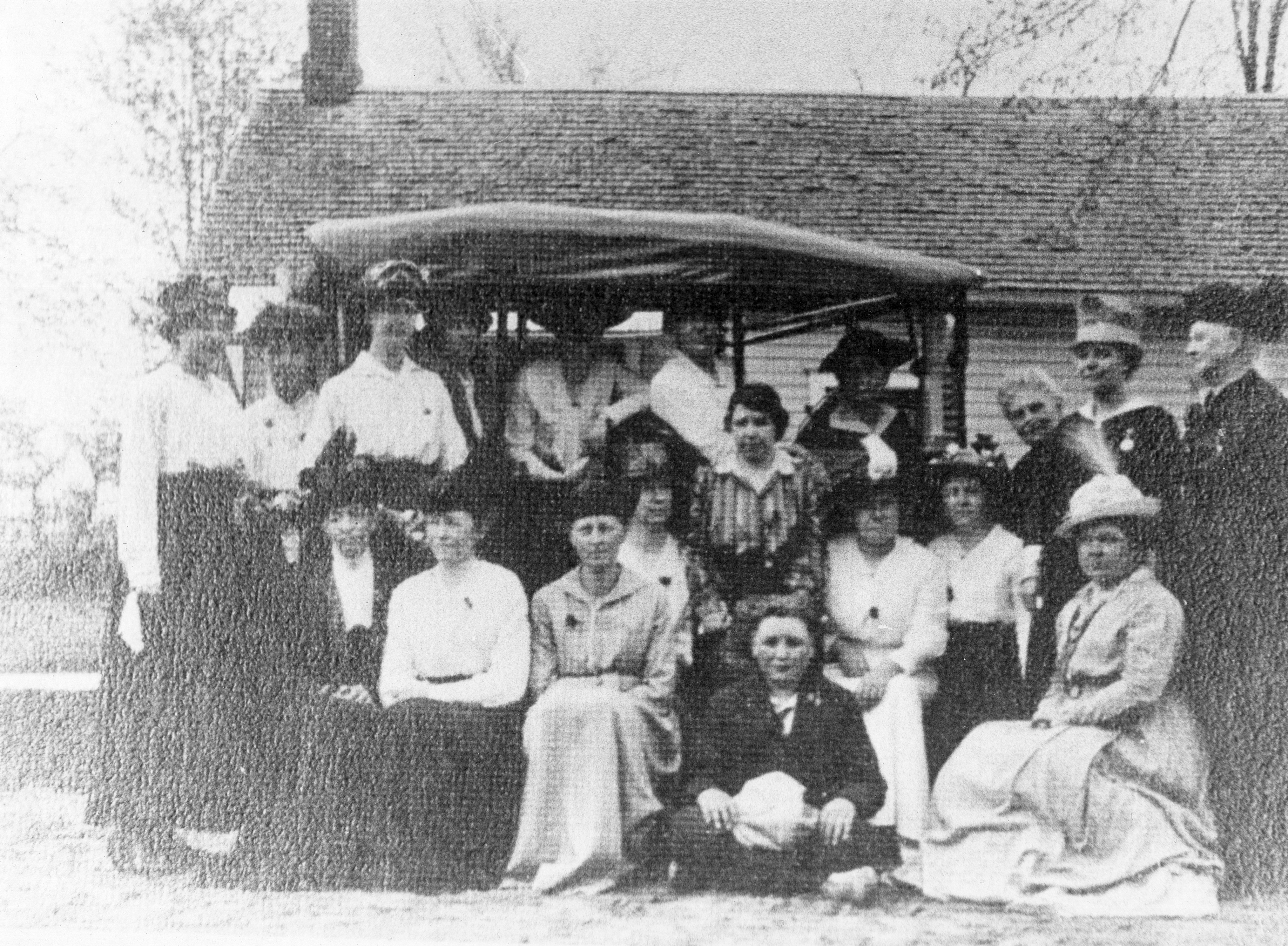 Photograph in front of the Daisy Chapel Studio, May 13, 1917. Those inside the car are unknowns. Standing left to right are two unknowns, Adelel Procter, Mrs. Tyler, Maggie Milner, Vesta Thompson. Seated left to right Mrs. Chappel, unknown, Ina Nichol, Mrs. Whitney, Rena Brownell Lantis, two unknowns, Mrs. Thompson. Seated in front Hugh Milner.