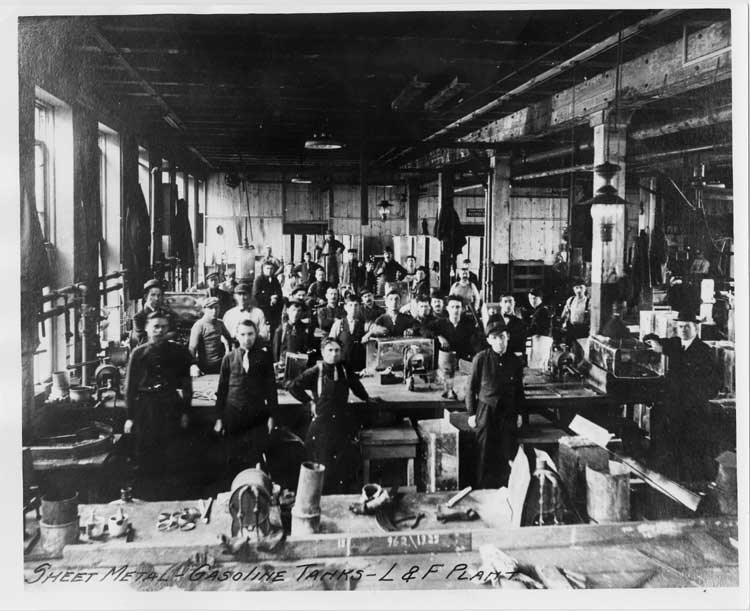 8x10 black and white photograph of men posed in a factory, image inscribed 'Sheet Metal- Gasoline Tanks- L&F Plant.'