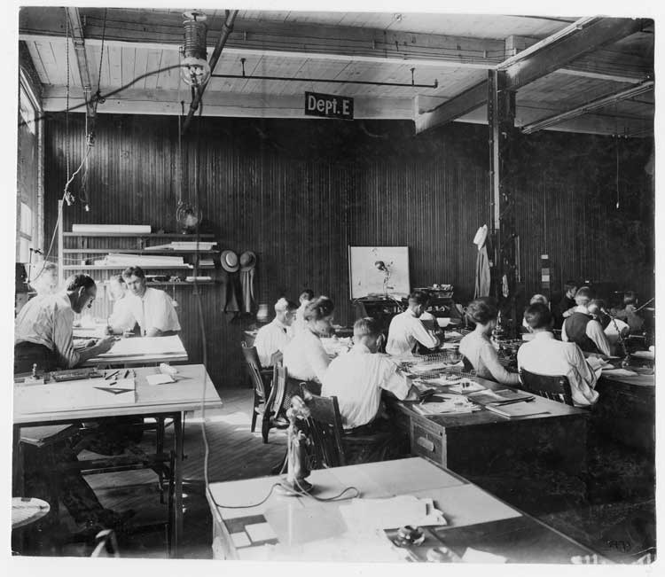 7.75x9.25 black and white photograph of office interior with office workers at desks.