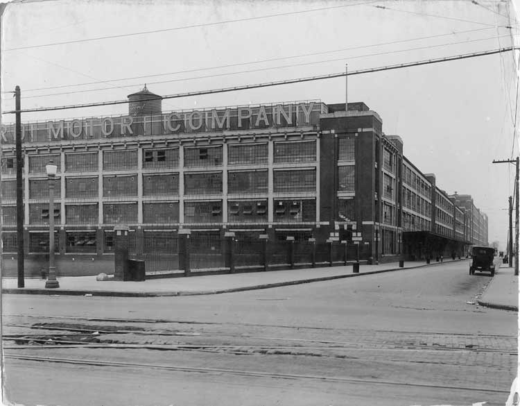 7.5x9.5 black and white photograph of Ford Motor Company Highland Park factory located at Woodward and Manchester showing front exterior of building.