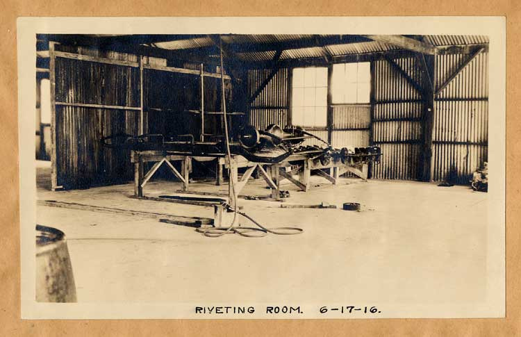 3.75x5.75 black and white sepia-toned photograph mounted on a scrapbook page showing the interior of the Liberty Motor Car Company riveting room.