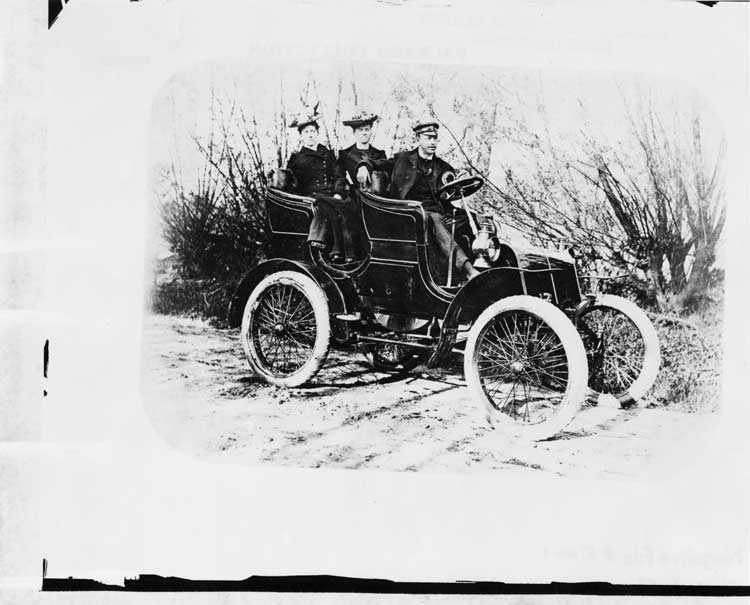 8x10 black and white photograph of a 1901 Packard Model C. Inscribed on photo back: 1-cylinder with chauffeur and two female passengers.