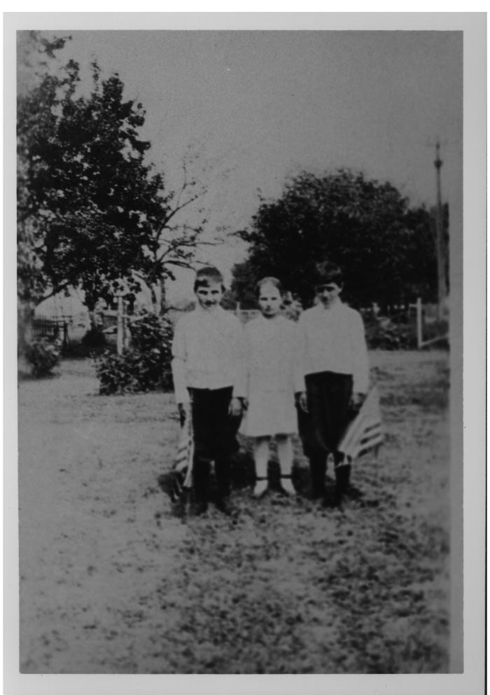 Roy, Evelyn and Austen Green are standing in the yard of the Green farm by American flags. Charles Green was in the military service in World War I at this time.