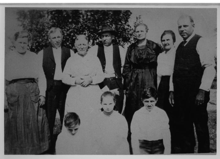 This group portrait was taken around 1917. In front L-R are Roy, Evelyn and Austin Green. Standing in back L-R are Mary, John Jr., Ernestine, William, friend Mary Salter, Ida and Fred Green.