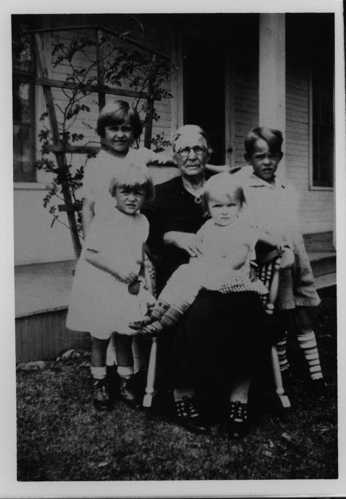 Ernestine Green is holding Mardell Green (b.1928). L-R are Elenore, FLorence and Edsel Prest. She is seated in front of the porch of the Selinsky/Green farmhouse on its original location on Eleven Mile Rd. at Grant.