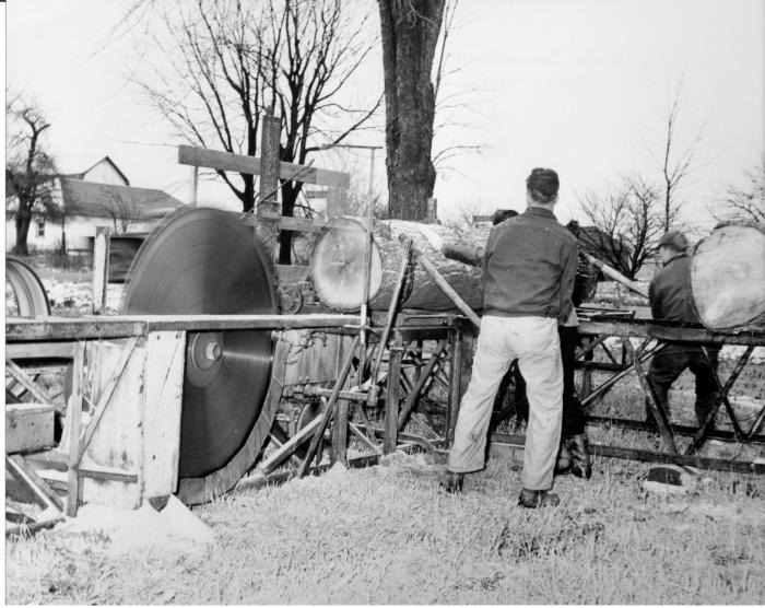 Marvin Hacker and Ed Werth position a log on the saw at Hacker Sawmill on 16 Mile Road between Ryan Road and Mound Road.
