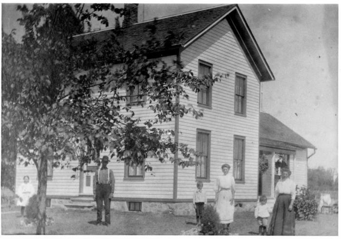 The Michael Bower House, located on the north side of 17 Mile Road, west of Mound Rd.. Rose Bower (Hacker) (1893-1988), her brother, stepmother, and half siblings stand in front of the home. The house was torn down for road widening in the 1980s.