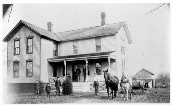 Hacker farmhouse, located on northeast corner of 16 Mile Road and Mound Road in Sterling Heights, Michigan. May be Fred Hacker (1844 - ?) with 6 of his 10 sons. Two horses stand with a wagon full of potatoes (?) alongside the house. A barn can be seen behind the house