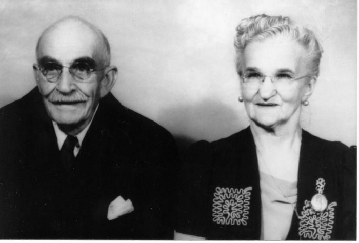 Portrait (head and shoulders) of August Marotz (1867 - 1950) and his wife Wilhelmina Fischer Marotz (1871 - 1956). The couple married in 1890. Their farm was on Clinton River Rd. south of 19 Mile Rd Sterling Heights, Michigan.