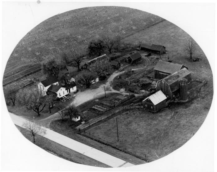 Aerial view of Lembke Farm, Hayes Road north of Clinton River Road in Sterling Heights, Michigan. Shows house, outbuilding, barn with added silo, large field with corn shocks. Hayes Road is paved.